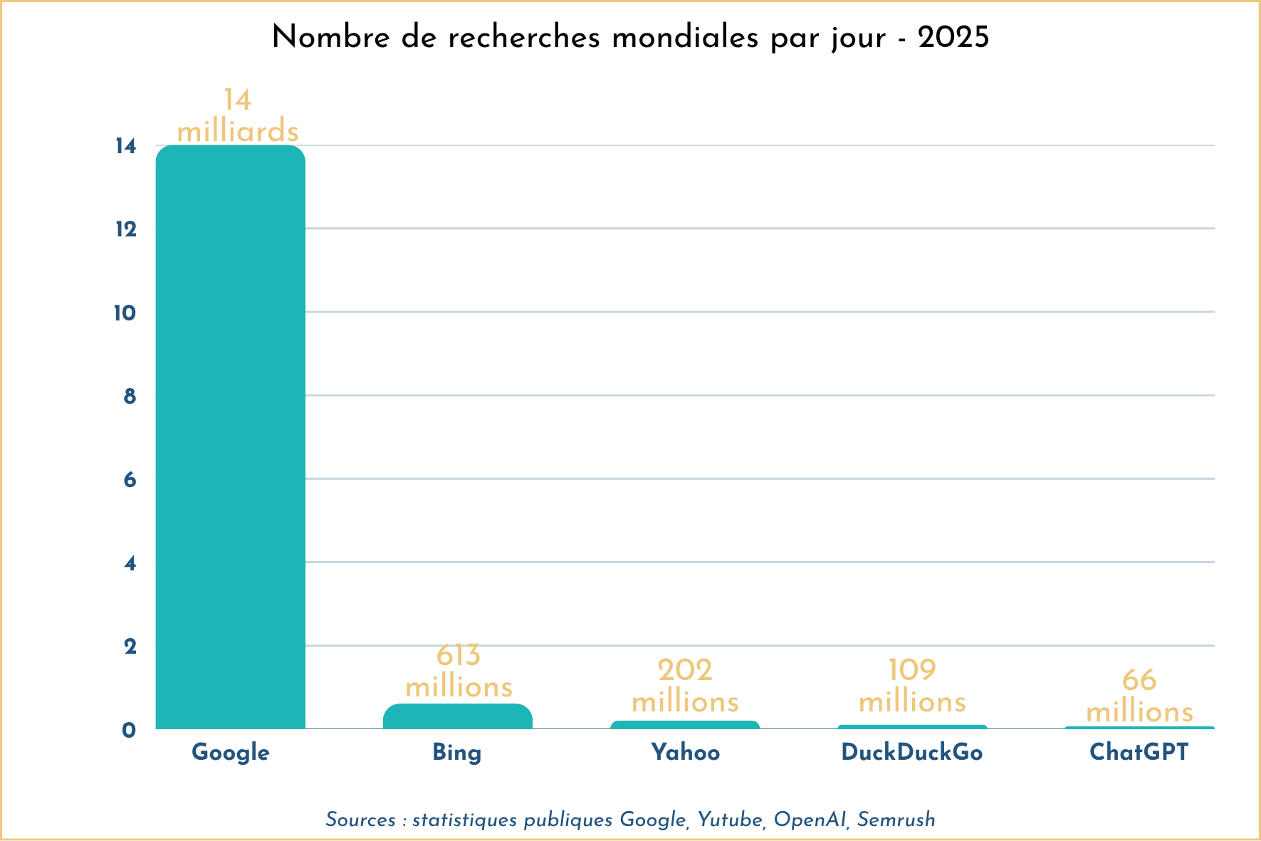 En résumé : L’IA devient la porte d’entrée, mais le moteur de recherche reste la route qui mène à vous. L’un ne va pas sans l’autre. Pour prendre un peu de recul, les chiffres parlent d’eux-mêmes : malgré tout l’engouement autour de l’IA, le volume de recherches quotidien sur Google reste écrasant face aux nouveaux arrivants.
